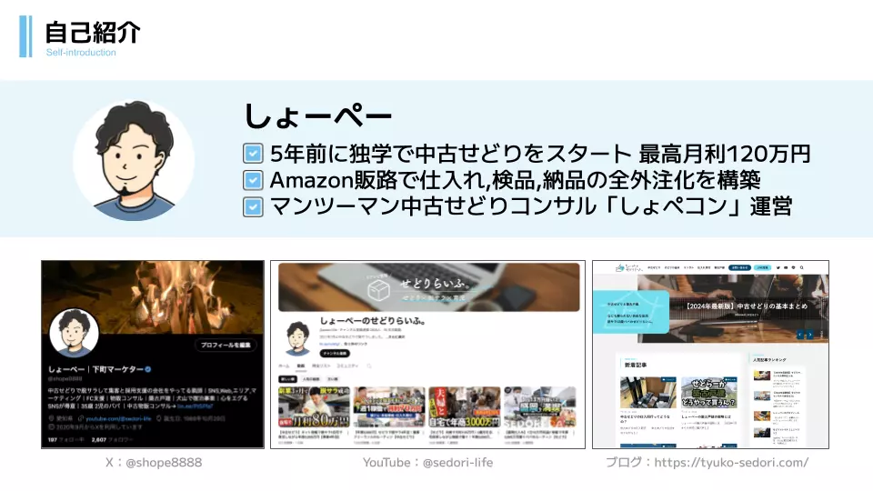 5年前に副業でせどりをスタートしてYouTubeにて発信、現在は全外注の構築を含めたマンツーマン中古せどりコンサル「しょぺコン」を運営しています。また企業さんの集客・採用支援のマーケティング会社の代表をしている猟師でもあります🐗