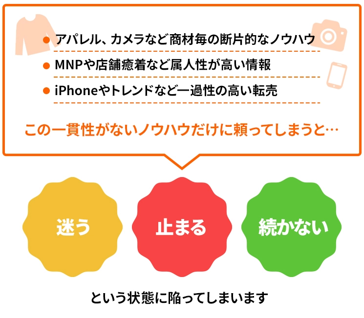 アパレル・カメラ・ホビー、店舗毎、買取、刈り取りやツール、メーカー卸、iPhone、トレンド…どれがいい悪いはとかはありません。