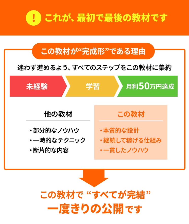 未経験から月利50万円までを迷わず進めるためのコンテンツは